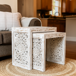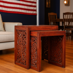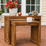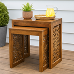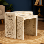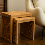 Perfect for both classic and contemporary interiors, this elegant set of 2 nesting tables adds a luxurious yet natural touch to any room. The detailed hand-carved patterns reflect the skill of our artisans, making every piece a unique work of art.